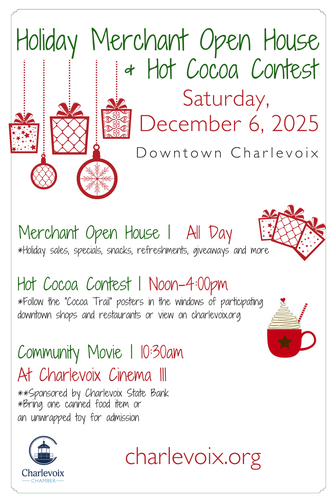 Warm up as you sample delicious cocoa creations from participating businesses. Vote for your favorite and help crown Charlevoix’s Best Hot Cocoa! Check back for the Cocoa Trail.